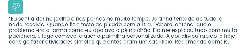 Com base nesse exame, a Dra. Débora cria uma estratégia de tratamento personalizada — e, se necessário, recomenda o uso de uma palmilha feita sob medida, desenvolvida especificamente para o seu tipo de pisada.